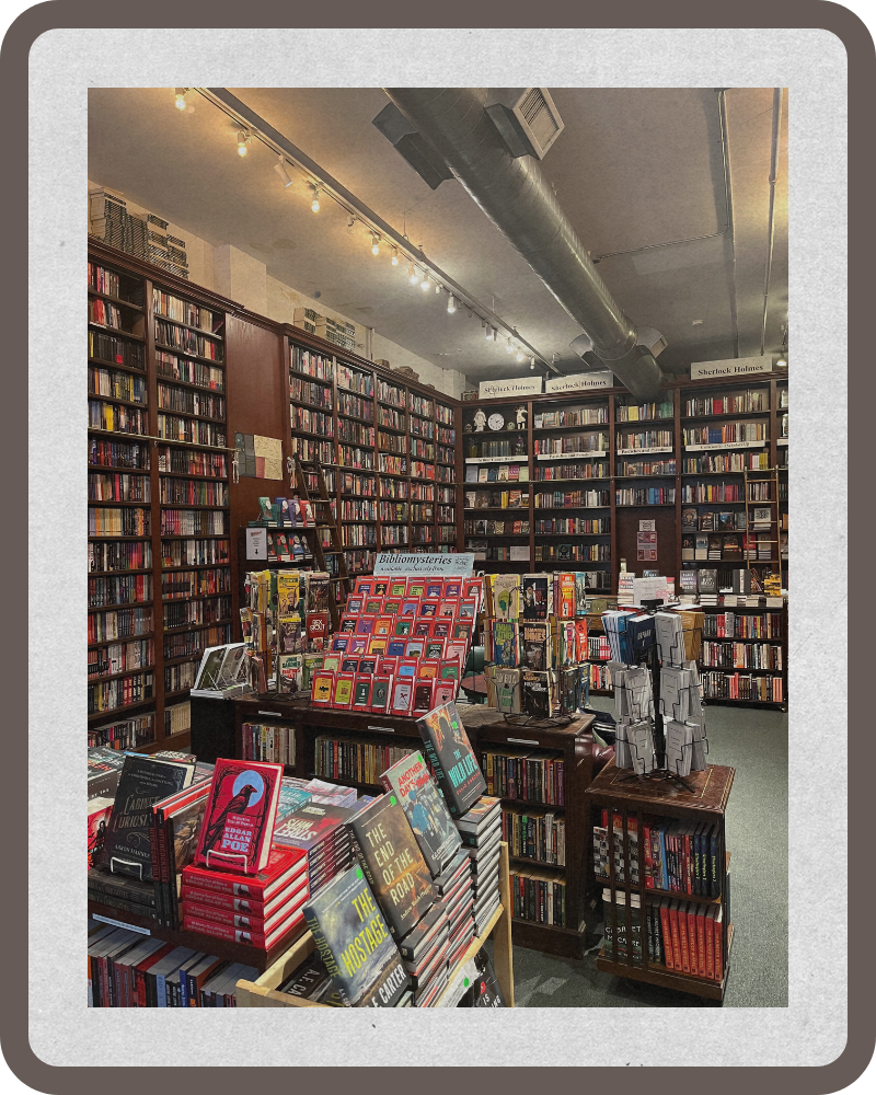 Der Laden mag auf den ersten Blick klein wirken, doch die deckenhohen Regale sind vollgestopft mit Büchern. Man benötigt sogar eine Leiter, um an die oberen Exemplare zu gelangen. Anfangs war es etwas kompliziert sich einen Überblick zu verschaffen, aber es ist definitiv für jeden Lesegeschmack etwas dabei. Es gibt eine große Auswahl an Agatha-Christie-Romanen, einen Regalabschnitt mit Sherlock-Holmes-Lektüren, ein Regal voll skandinavischer Thriller, etwas Stephen King und eine Theke mit Fachliteratur und True Crime. Mittig im Laden gibt es eine gemütliche Couchecke, die zum Lesen einlädt, sowie eine gute Auswahl an gebrauchten Büchern und günstigen Groschenromanen. Da es sich um einen amerikanischen Buchladen handelt, sind alle Bücher selbstverständlich auf Englisch. Viele Bücher wurden allerdings bereits ins deutsche Übersetzt.