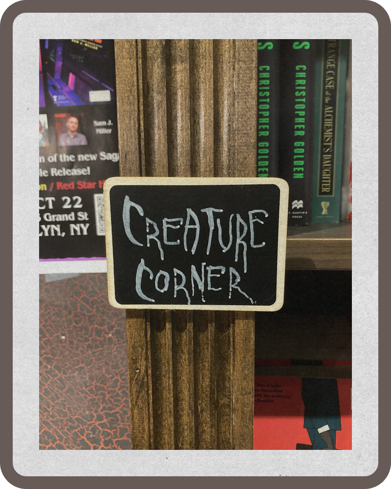 Die Atmosphäre ist einzigartig. Im Vorraum findet man aktuelle Neuerscheinungen; dahinter gelangt man in den Hauptraum, der eine düster-gemütliche Stimmung besitzt. Bücherregale stehen überall, sortiert nach Subgenres. Das macht die Suche nicht immer einfach. So findet man z.B. Stephen Kings Es in der Kategorie Coming of Age, während z.B. The Shining in der Abteilung Haunted Houses steht.